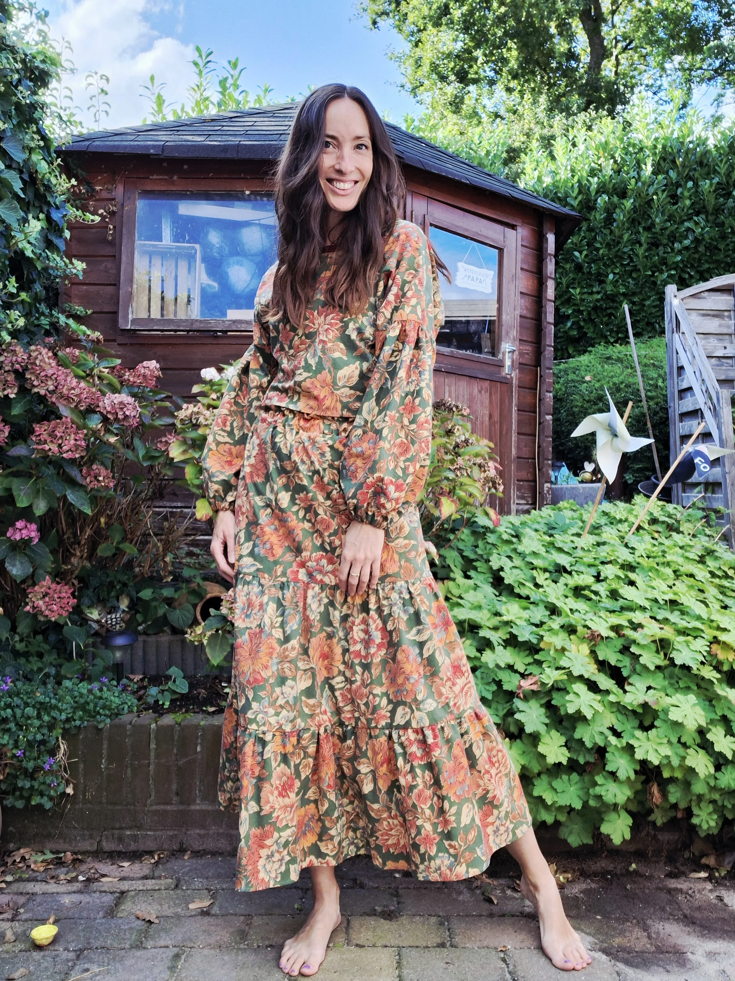 ik ben Sanne en ik ben verslaafd… aan stoffen, fournituren, bedenken, creëren en het in elkaar zetten van alles wat er uit mijn hoofd rolt. In 2021 kroop ik achter de naaimachine van een vriendin en sindsdien ben ik er niet meer achter vandaan gekomen. Mijn eerste creaties maakte ik op de oeroude naaimachine van mijn oma en daarna op de naaimachine die ik van mijn moeder cadeau kreeg. Ik begon met tassen en etuis en al snel maakte ik de kleertjes van mijn zoon en dochter en daarna ook voor mezelf. Fastfashion komt niet in mijn woordenboek voor. Ik maak alles zelf of koop het tweedehands.